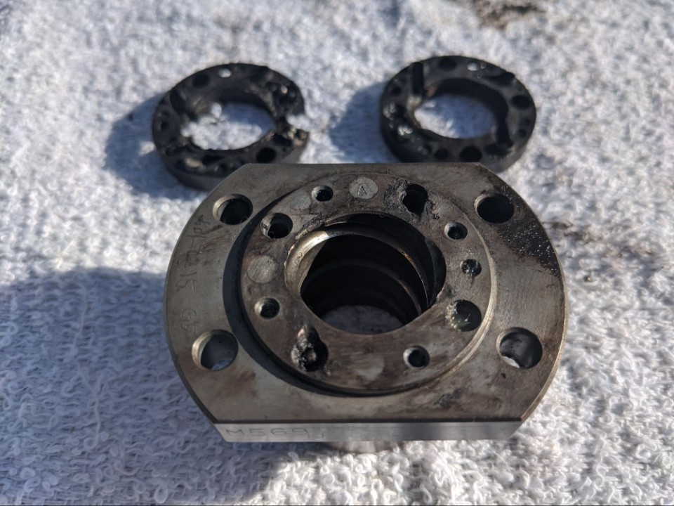 The ball nut from the Z-Axis on a Mazak Optiplex 3015 Laser was starved for lubricant and filled with cutting debris when the machine failed. Over time, it eventually blew out one of the internal ball bearing recirculation guides. The first choice was to acquire a new replacement ball nut and ball screw assembly. However, many customers found that these were backordered, in some cases, for more than a year. Ballscrew Guys could rebuild a ball nut in a condition like shown above and get the laser back to cutting parts, working with the parts available, not the ones waiting to arrive from Japan.