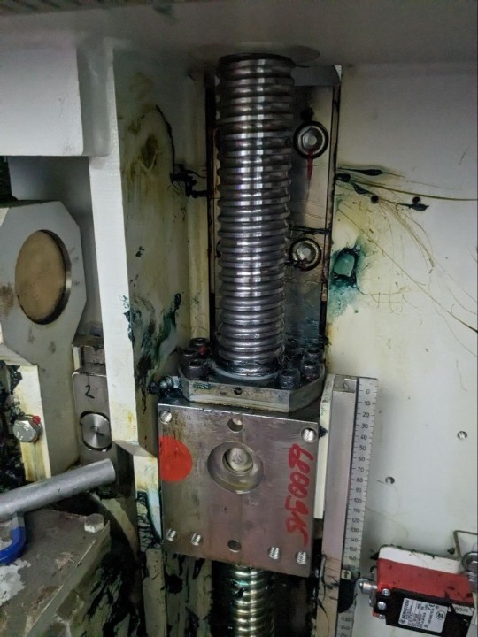 Left side vertical ball screw assembly. Notice the grease fitting. The lubrication preventative maintenance was missed on this assembly. Perhaps from the day the machine was installed. When Ballscrew Guys was called in to service this, we found it heavily greased. Fresh grease. But it was way too late. The ball bearings inside were already growling. To service and refurbish the ball screws on these machines, there is perhaps a full day of machine disassembly. Same for reassembly. Because the left and right ball screws and servos must be timed properly, a CNC technician familiar with Schroder operating and controller systems may be required after ball screw service.